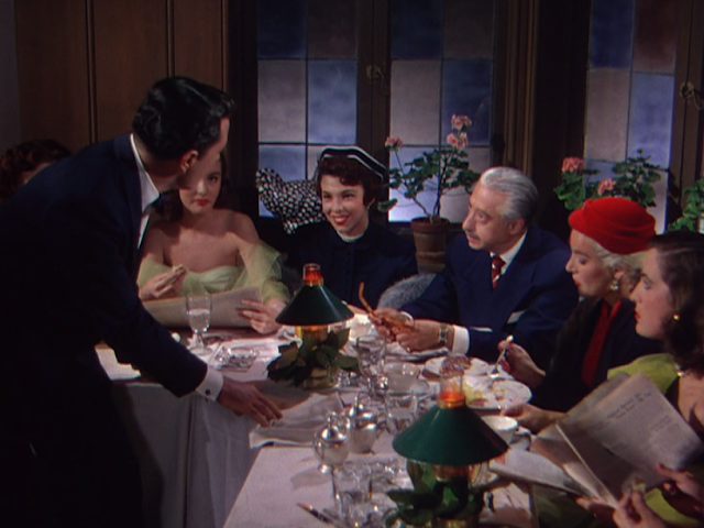 While he is waiting for Julie to change, Barry goes downstairs and is feeling so happy that he bursts into "That's What a Rainy Day is For." Vic Mizzy and Mann Curtis are completely unknown to me, but they wrote this song, "Didja Ever," and "Look Out, I'm Romantic," and they are just wonderful in this movie, especially with Tony Martin's beautiful voice. ("Little Coquette," by the way, was written by Gus Kahn, Johnny Green, and Carmen Lombardo, Guy's sister.) Vic Mizzy certainly had a gift for a